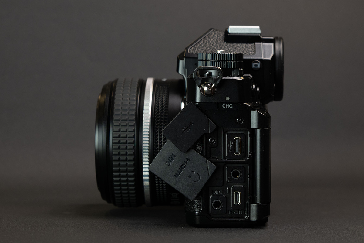 니콘 Z f 카메라의 왼쪽 사이드에는 USB-C 포트와 이어폰, 마이크 단자(3.5mm), 미니 HDMI 포트가 있습니다.