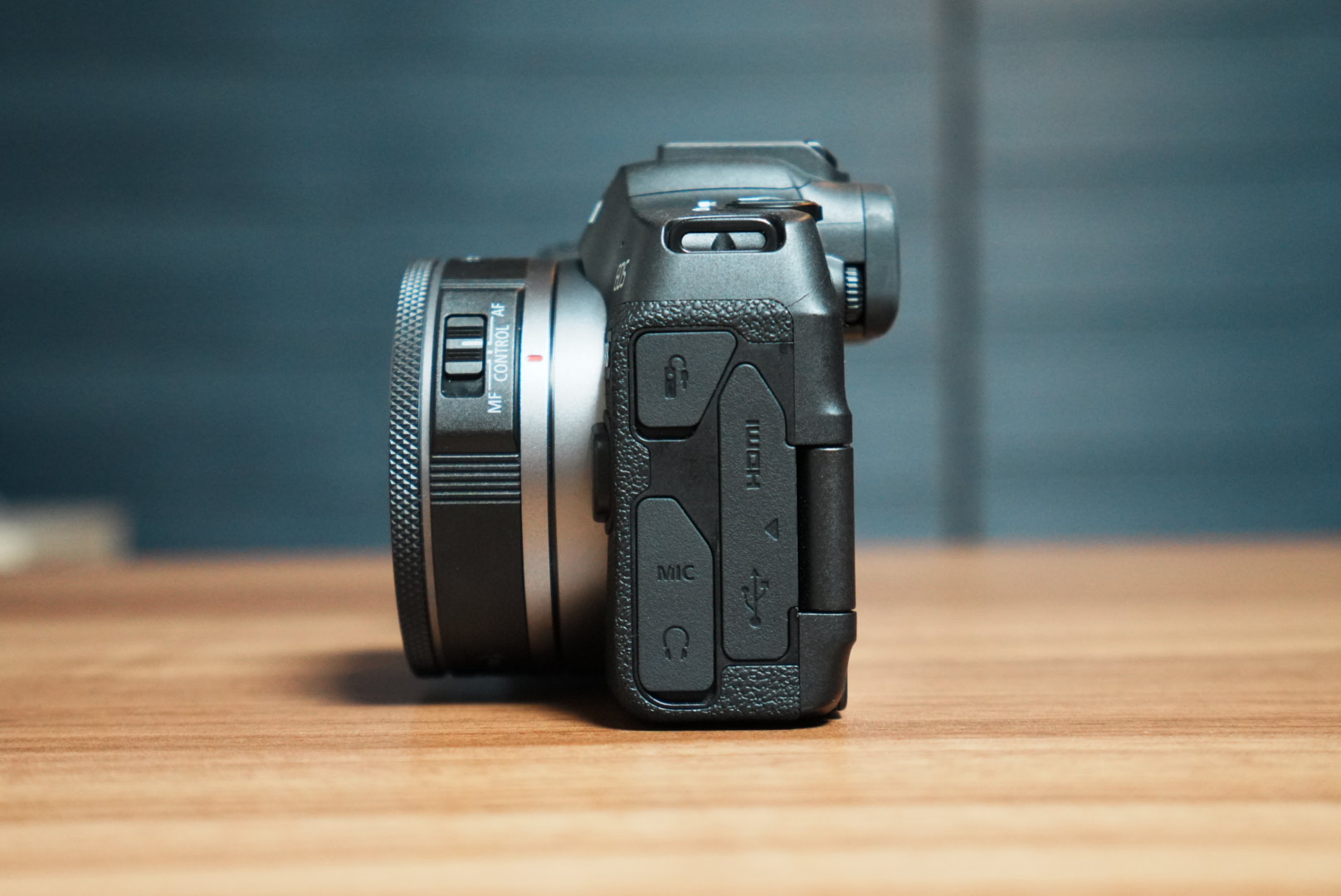 카메라의 왼쪽 사이드 면에는 케이블을 꽂을 수 있는 각종 단자들이 있습니다. USB C 타입의 충전을 지원하며 마이크 단자와 이어폰 단자, HDMI 단자 지원됩니다.