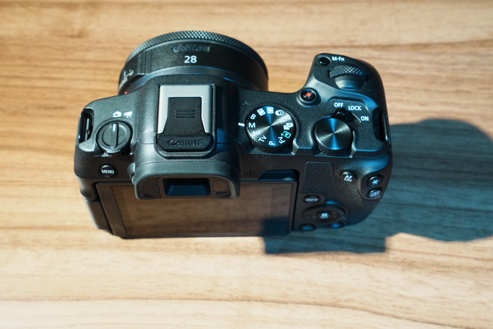 상단 다이얼의 모습을 보면 왼쪽에 사진과 동영상을 전환할 수 있는 다이얼이 있었습니다. 사진 촬영을 할 때 셔터버튼과 다이얼 그리고 손에 움켜쥐었을 때 그립감이 좋았습니다. 바디가 가벼워서 혹시 손가락이 남거나 하는 등의 우려가 있을듯 하지만 성인 남성인 제 손으로 캐논 EOS R8을 쥐었을 때 한 손에 쏙 들어오는 느낌이 좋았습니다.