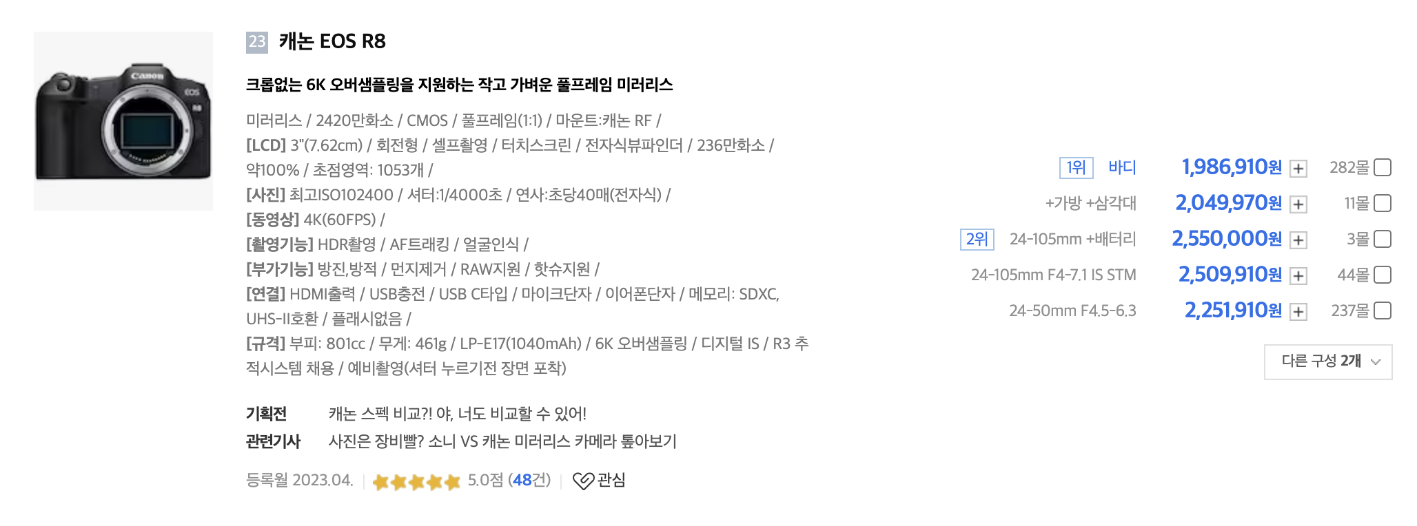 2023년 11월 지금 이 시점에서 가장 핫한 소니의 보급 풀프레임 기종이 바로 A7C2이며 가격은 다나와 기준 최저가 255만원(바디) 입니다. 그에 비해 캐논의 보급 풀프레임 EOS R8은 다나와 기준 최저가 198만원(바디)에 책정되어 있어 상당히 경쟁력 있는 가격을 형성하고 있습니다.