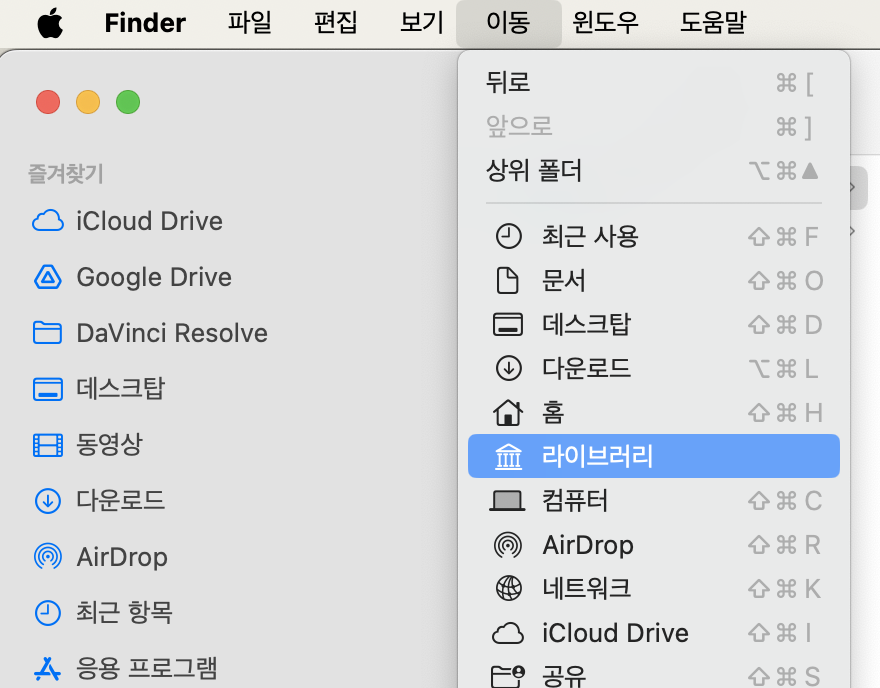 1. Finder를 여신 후 상단 메뉴 [이동]을 누른 후 option키를 누릅니다. 숨겨져있던 [라이브러리]가 나타나는데 [라이브러리]를 클릭합니다.