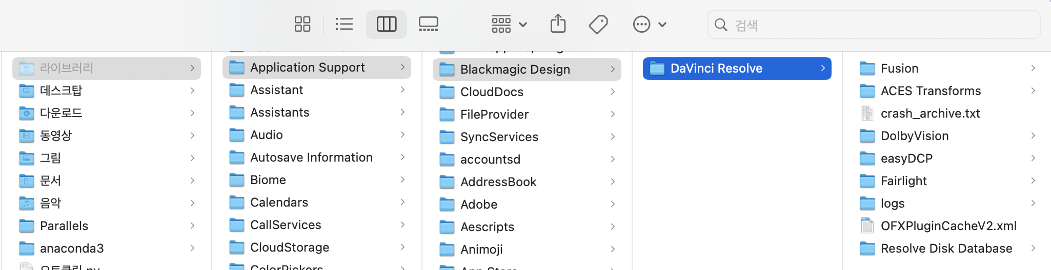 2. [라이브러리]로 이동한 후 [Application Support] - [BlackMagic Design] - [Davinci Resolve]로 이동합니다.