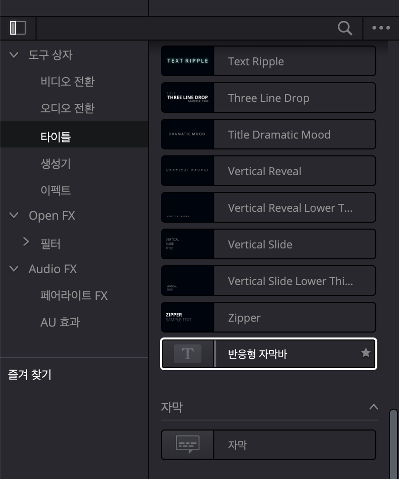 6. 왼쪽 하단 도구 상자에서 타이틀 - 타이틀 아래쪽으로 스크롤하여 이동하면 반응형 자막바 파일이 나타납니다.