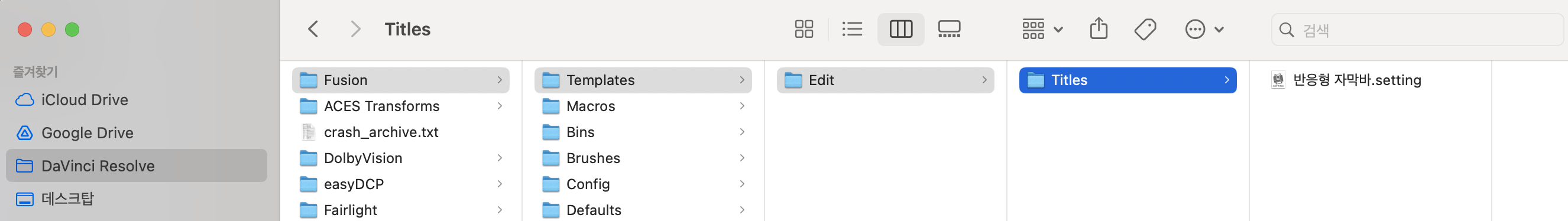 3. 다빈치 리졸브 폴더 안에 [Fusion] - [Templates] - [Edit] - [Titles] 에 반응형 자막바.settings 파일을 붙여넣기 합니다.