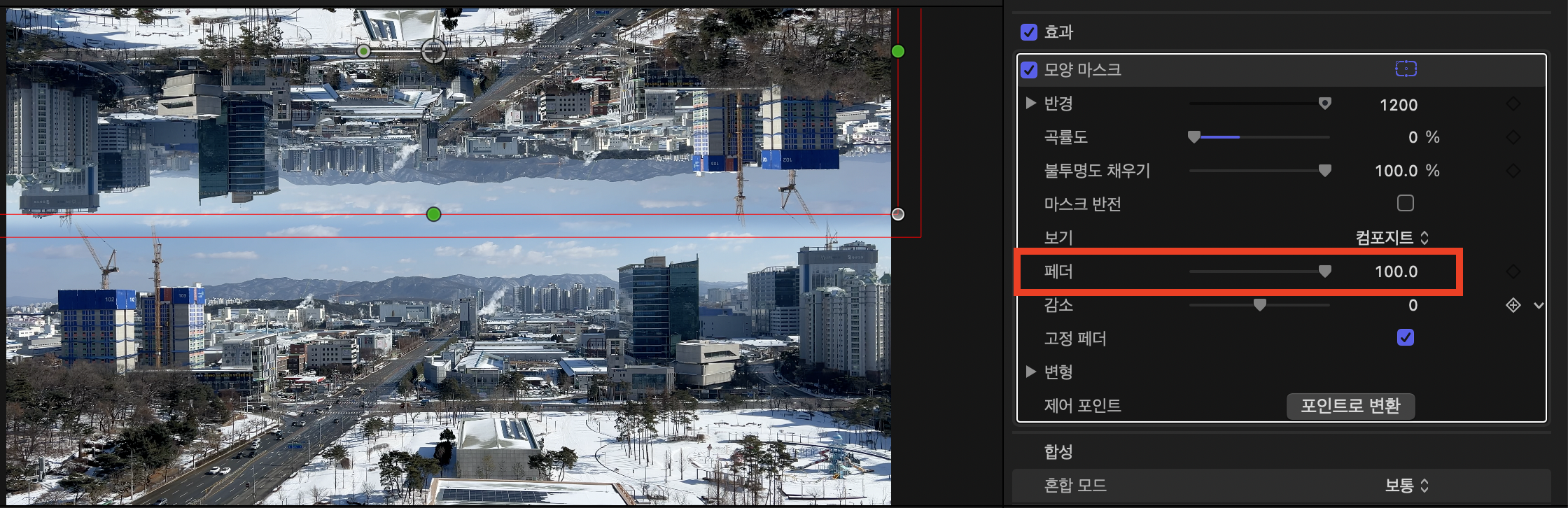 모양마스크에는 페더 옵션이 있어서 좀 더 간편하게 나타낼 수 있습니다.