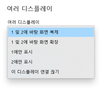 디스플레이 설정을 확인해보니 1 및 2에 바탕화면 복제로 설정되어 있습니다.