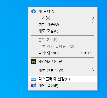 윈도우에서 화면 설정하는 방법은 바탕화면에서 마우스 우클릭한 후 [디스플레이 설정]으로 들어갑니다.