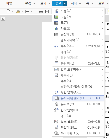 - '문서 끼워 넣기' 기능 사용: 상단 메뉴에서 [입력] 탭을 클릭한 후, [문서 끼워 넣기] 옵션을 선택합니다.