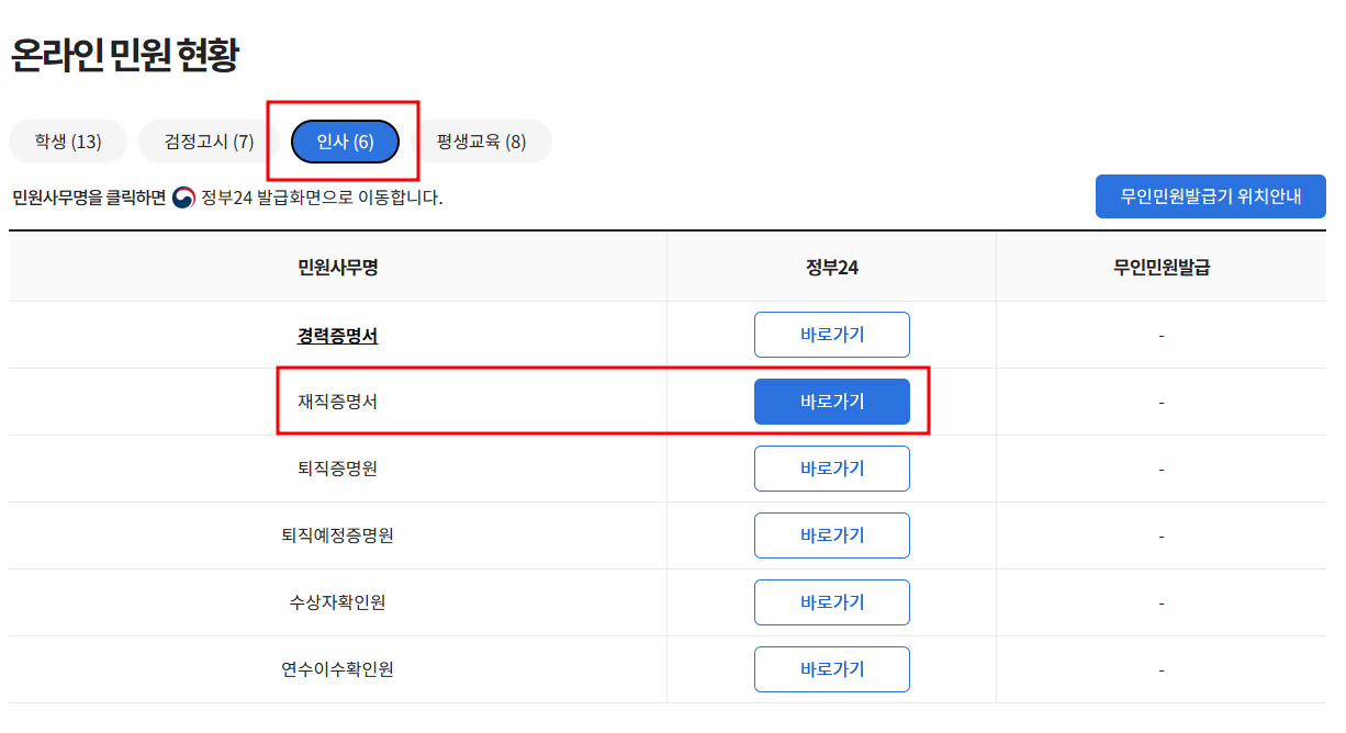 재직증명서는 정부24 사이트를 통해 발급받을 수 있습니다.