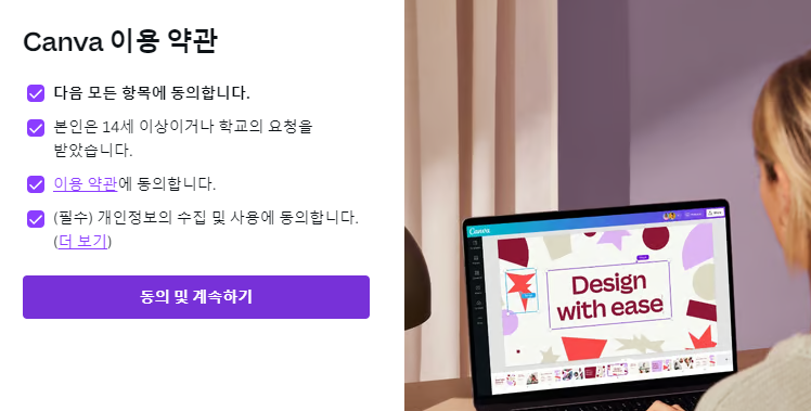 가입 버튼을 누르면 아래 그림과 같이 canva 이용 약관 대화상자가 나타납니다.