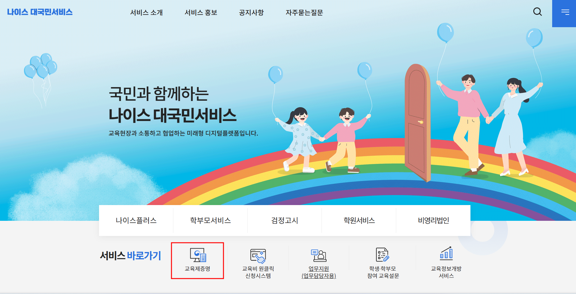 나이스대국민서비스 메인 홈에서 [교육제증명] 버튼을 클릭합니다.