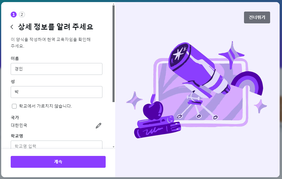 상세정보를 입력합니다. 이름과 성을 넣고 학교명을 입력합니다.