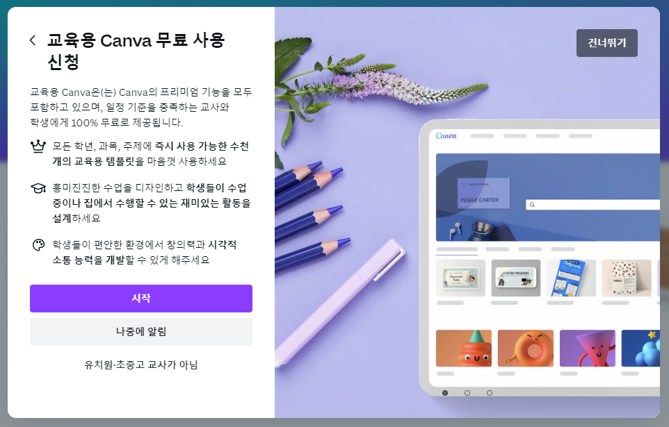 캔바가 교육 목적으로 교직원과 학생은 프로 기능을 무료로 제공해주어서 교수학습에도 유용하게 사용할 수 있습니다.