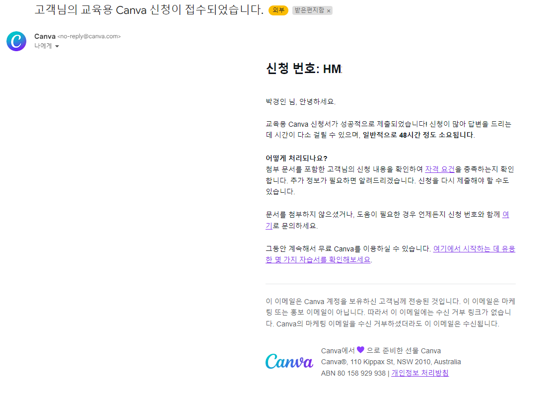 그리고 이 PDF 파일을 아까 캔바 인증 2단계에서 첨부해주면 아래처럼 접수되었다는 메일이 도착합니다.