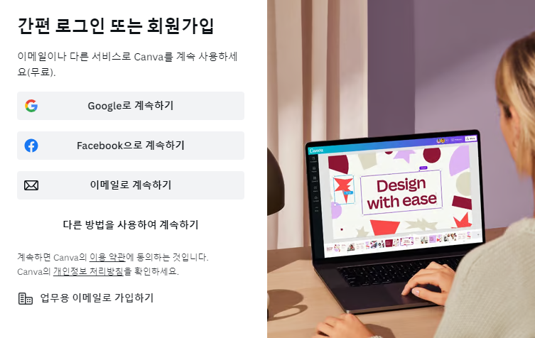 캔바는 구글과 페이스북 계정으로 로그인하는 기능을 지원합니다.