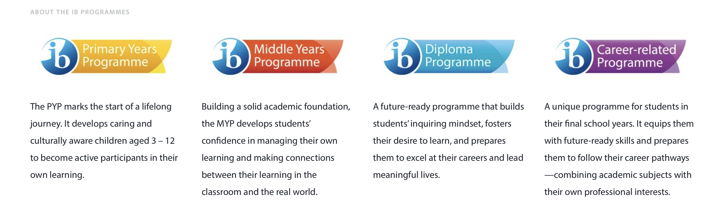 IB 프로그램은 크게 4단계(초등-PYP, 중등-MYP, 고등-DP, 고등진로직업-CP)로 나누어져 있습니다.