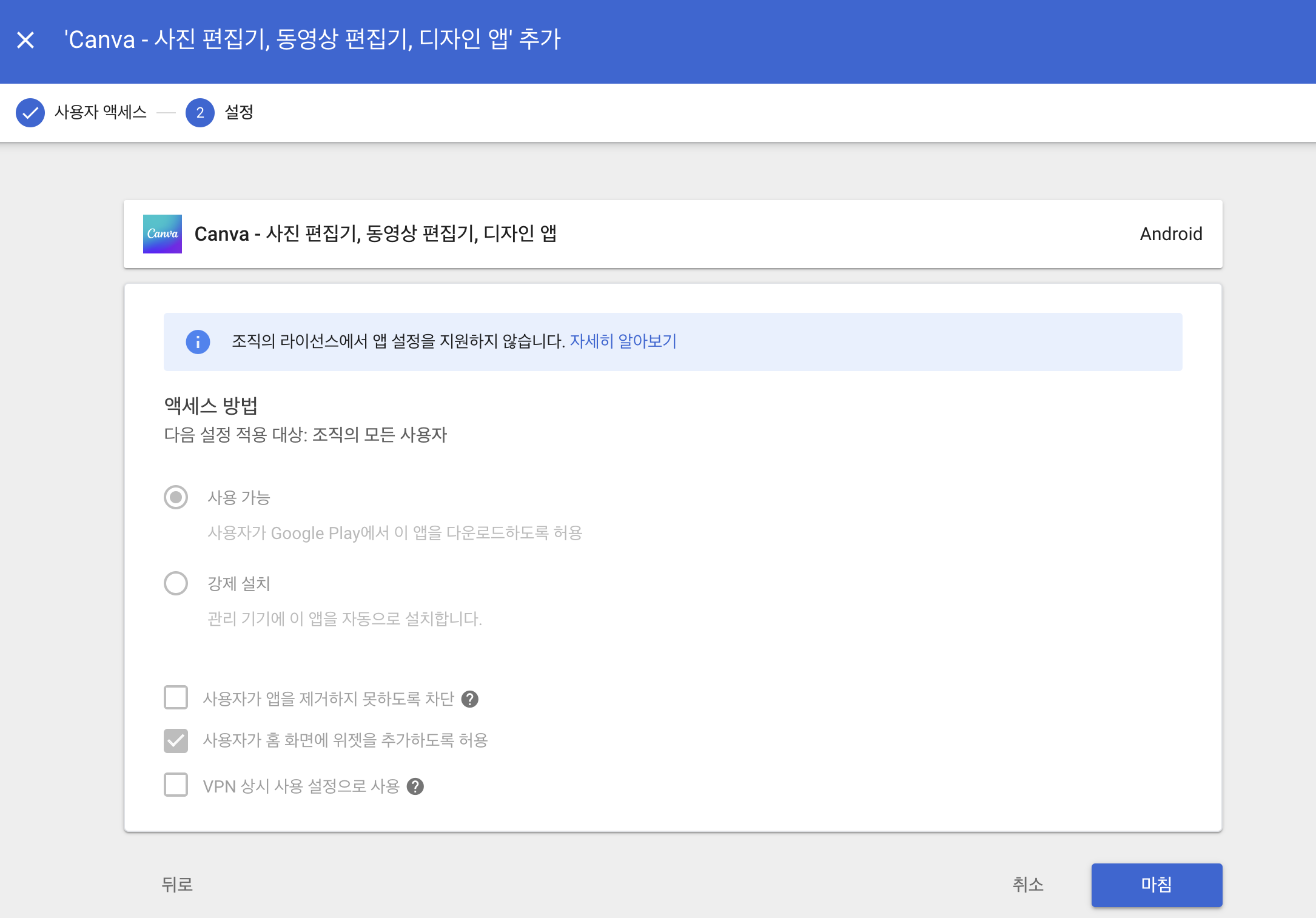 5. 학교 구글워크스페이스가 기본 라이센스라서 앱 강제설치나 이런 부분을 설정할 수 없습니다. 마침을 클릭합니다.