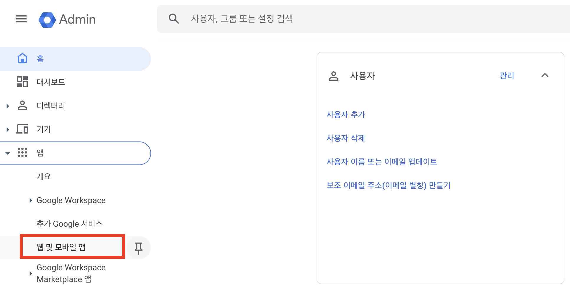 2. 왼쪽 사이드바 메뉴 [앱]을 클릭한 후 [웹 및 모바일 앱]으로 들어갑니다.