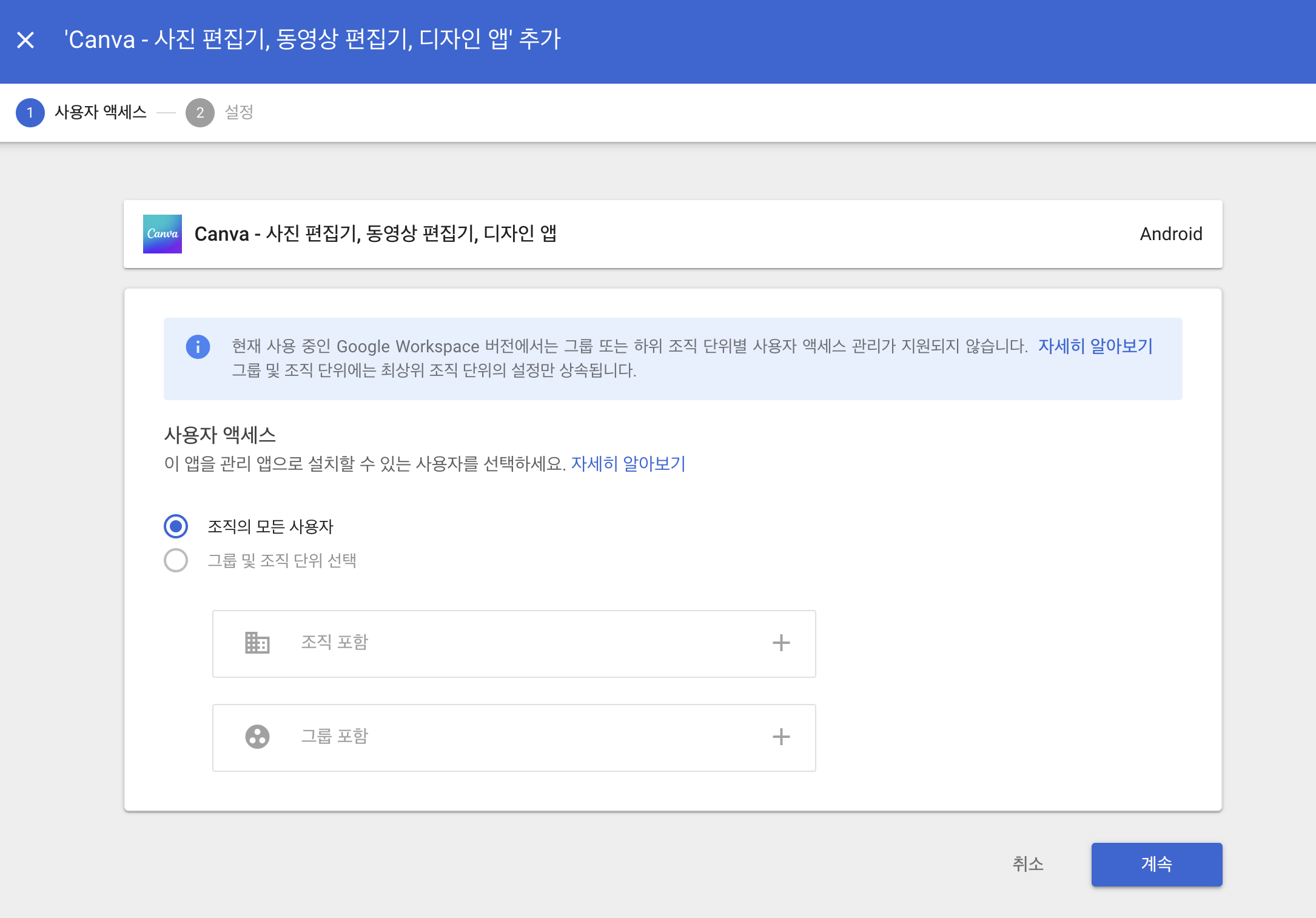 4. 캔바(Canva) 앱을 사용할 수 있는 사용자 범위를 결정합니다. 조직의 모든 사용자로 체크한 후 계속을 클릭합니다.