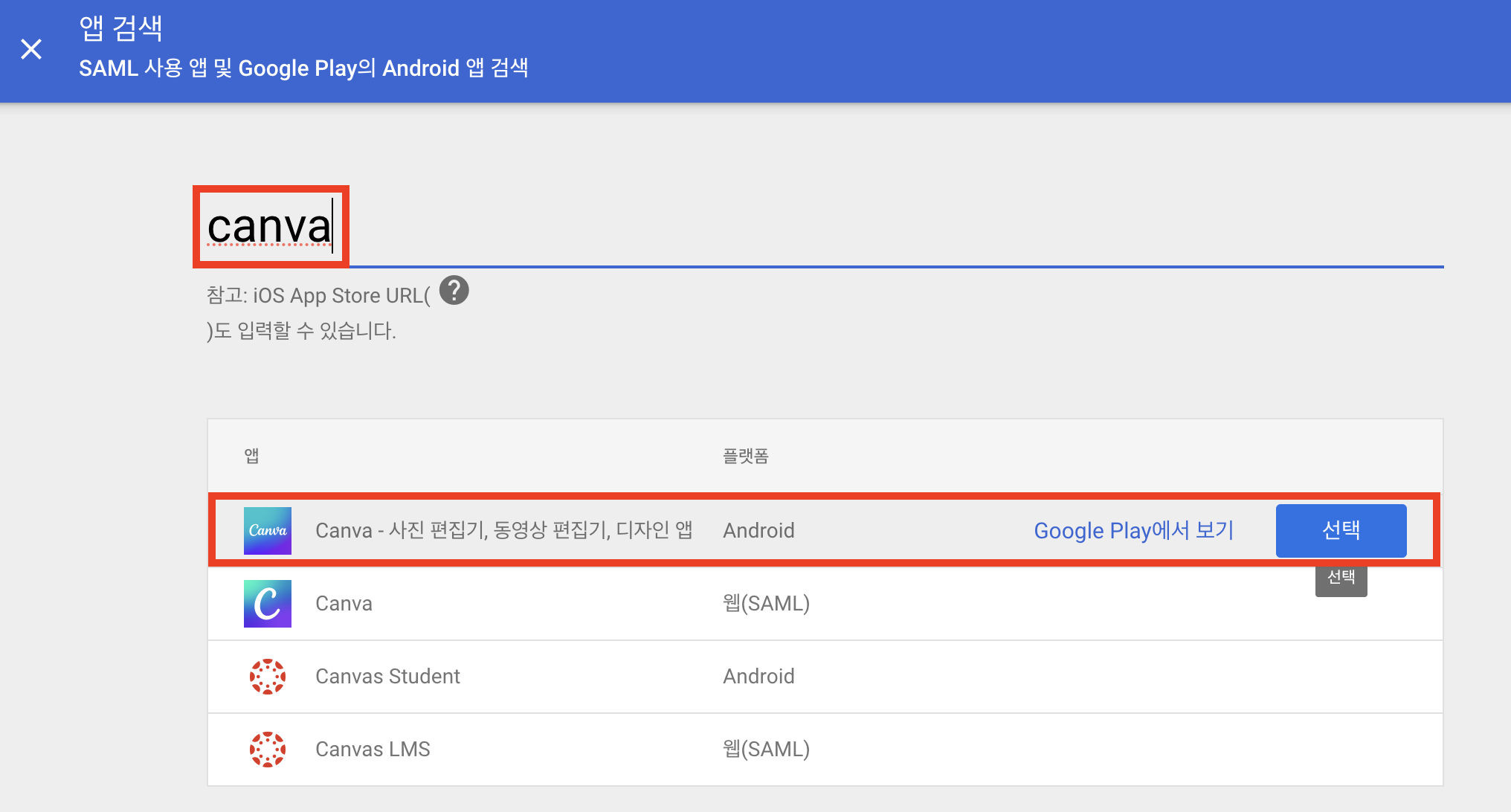 3. 앱을 검색하는 화면이 나옵니다. 한글이 아닌 영어로 'canva'를 검색합니다. 플랫폼이 Android로 나오는 Canva의 오른쪽 부분으로 마우스를 가져다 댄 후 선택을 클릭합니다.