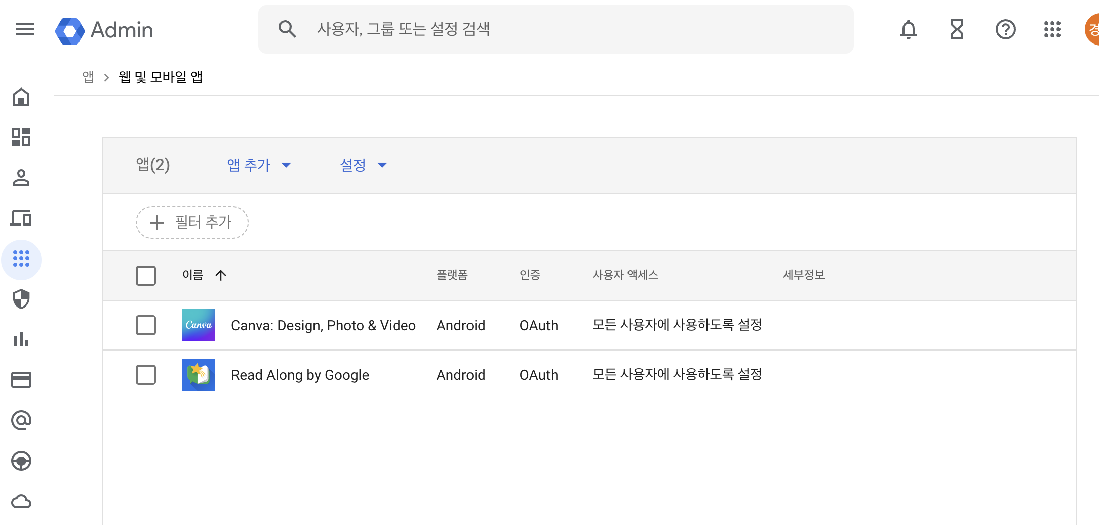 학교 구글워크스페이스 계정을 이용해 회원가입을 하려는데 서비스가 막혀 있는 경우 위에서 서술한 방법처럼 캔바가 아닌 다른 앱 역시 추가하여 사용할 수 있습니다. [웹 및 모바일 앱]에 해당 앱 서비스를 추가시켜주면 해결됩니다.