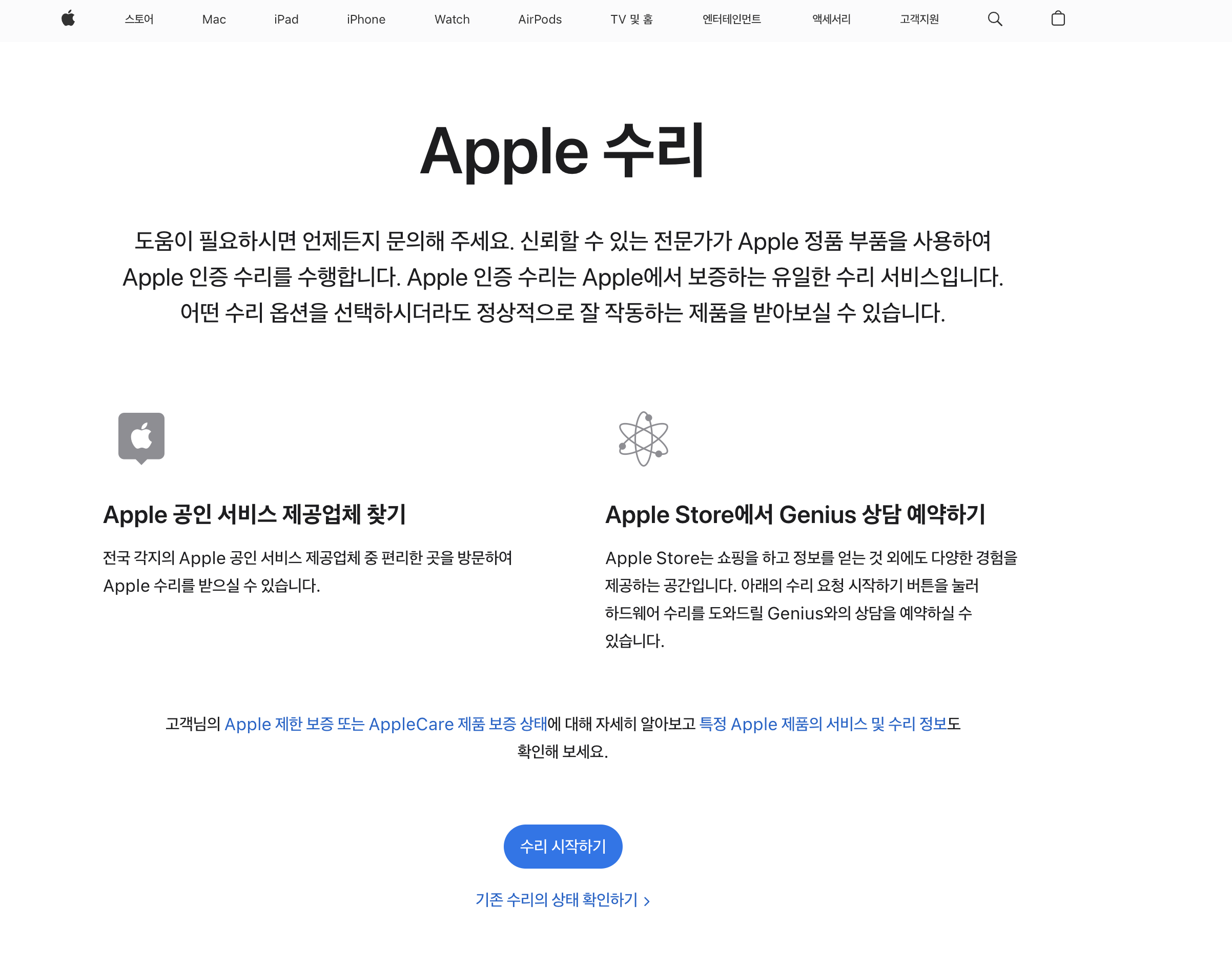 - 애플 수리 및 서비스 상태 확인 페이지에서 서비스 신청을 진행할 수 있습니다.