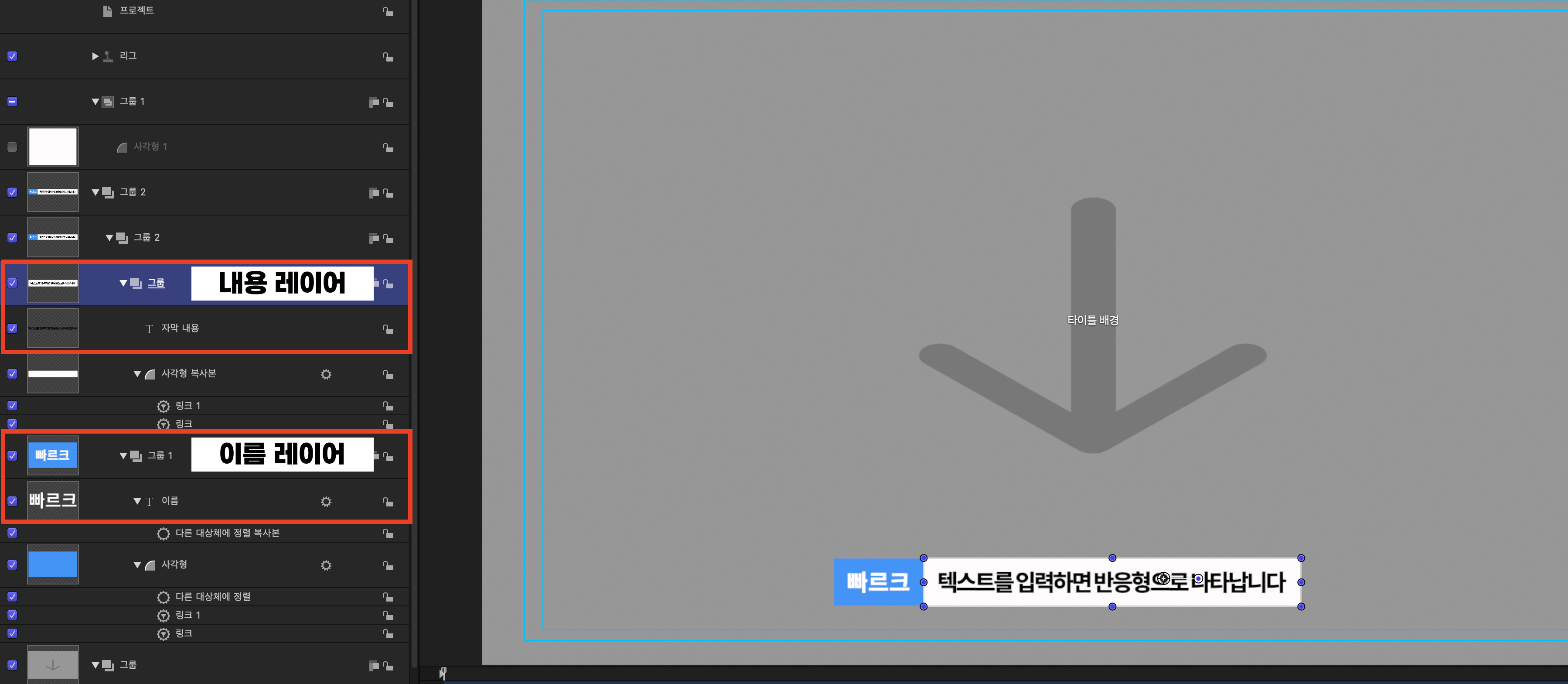 이때 팁은, 내용 레이어를 상단에, 이름 레이어를 그 아래에 위치시키는 것입니다. 이렇게 하면 자막을 입력할 때 이름 부분은 그대로 유지되고, 내용만 바뀌는 방식으로 템플릿을 제작할 수 있습니다.