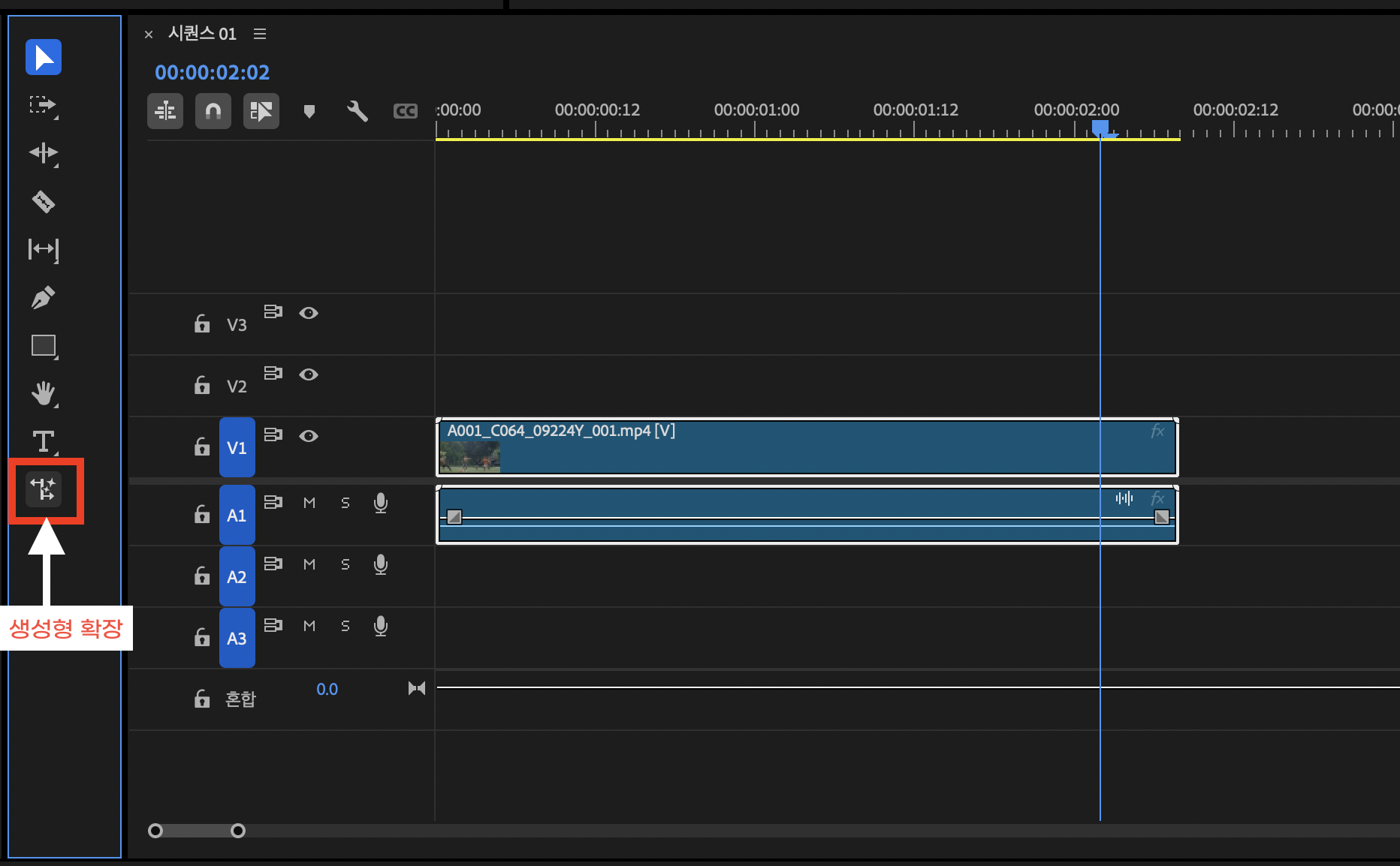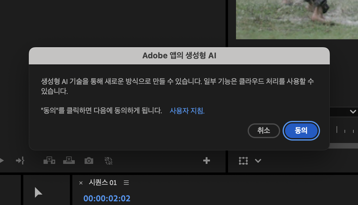 생성형 확장을 처음 사용할 때는 사용 동의 절차가 필요합니다. 동의 버튼을 클릭한 후 기능을 활성화하면, 클립의 끝을 선택해 확장 작업을 시작할 수 있습니다.