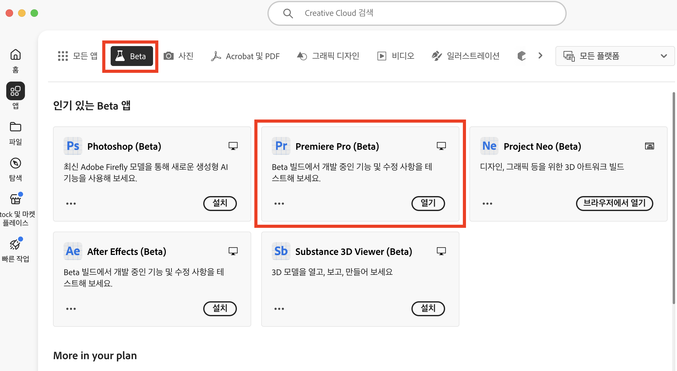- 어도비 크리에이티브 클라우드에서 베타 프로그램 섹션을 찾으세요.