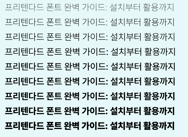 프리텐다드 폰트는 총 9개의 굵기로 구성된 개별적인 폰트 파일이 있는데 모두 설치하시면 됩니다.
