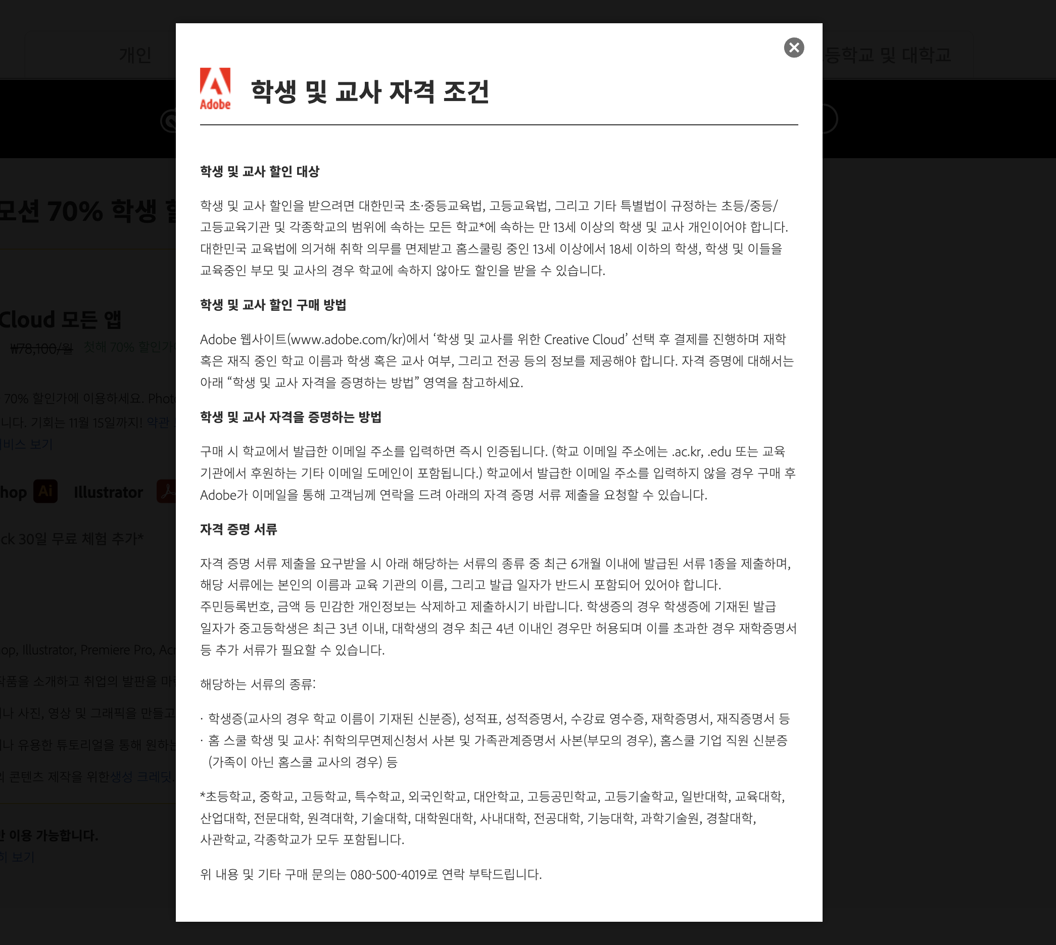 교육용 할인을 받기 위해서는 학생 및 교사에 해당하면 됩니다. 대한민국의 초중등교육법, 고등교육법, 그리고 기타 특별법이 규정하는 초등/중등/고등교육기관 및 각종학교의 범위에 속하는 모든학교가 해당하고, 여기에 다니는 만 13세 이상의 학생 및 교사이어야 합니다.