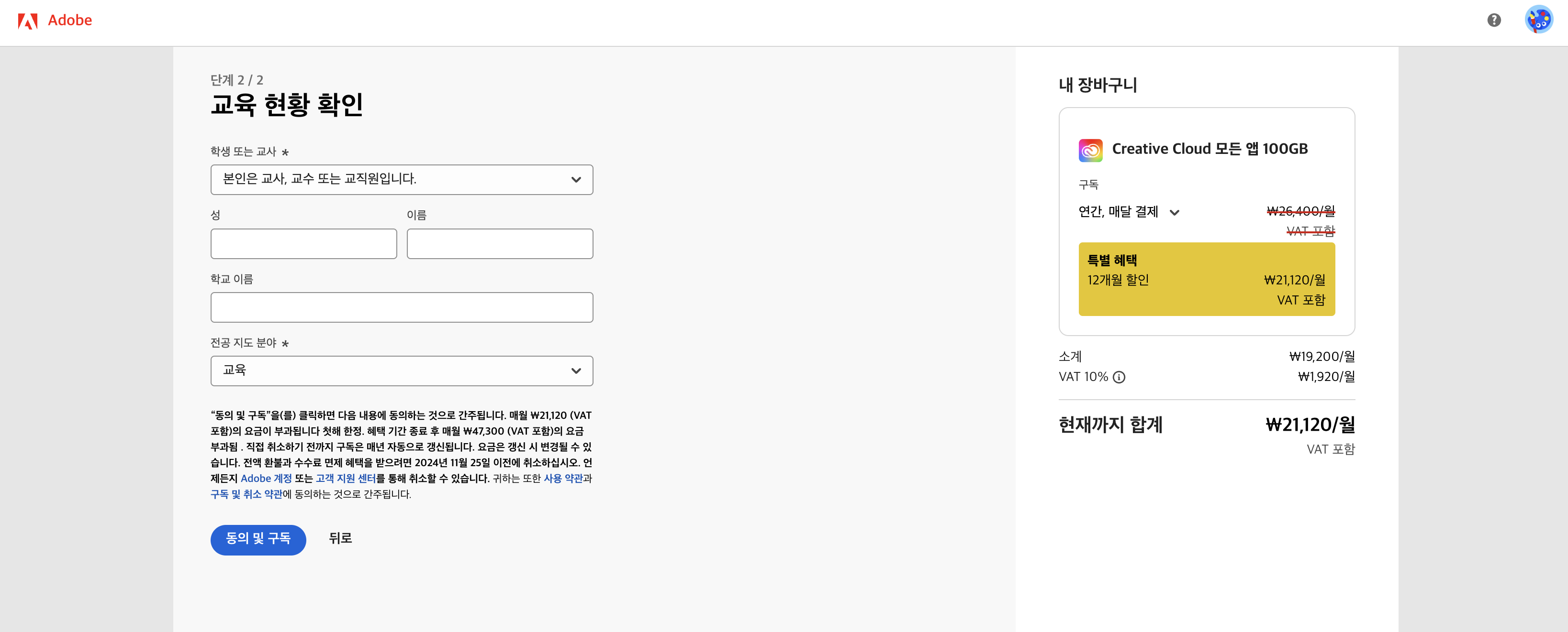 증빙서류 업로드와 같은 절차가 없어 의아하긴 하지만 해당 정보를 모두 입력한 후 '동의 및 구독'을 누르면 완료됩니다.