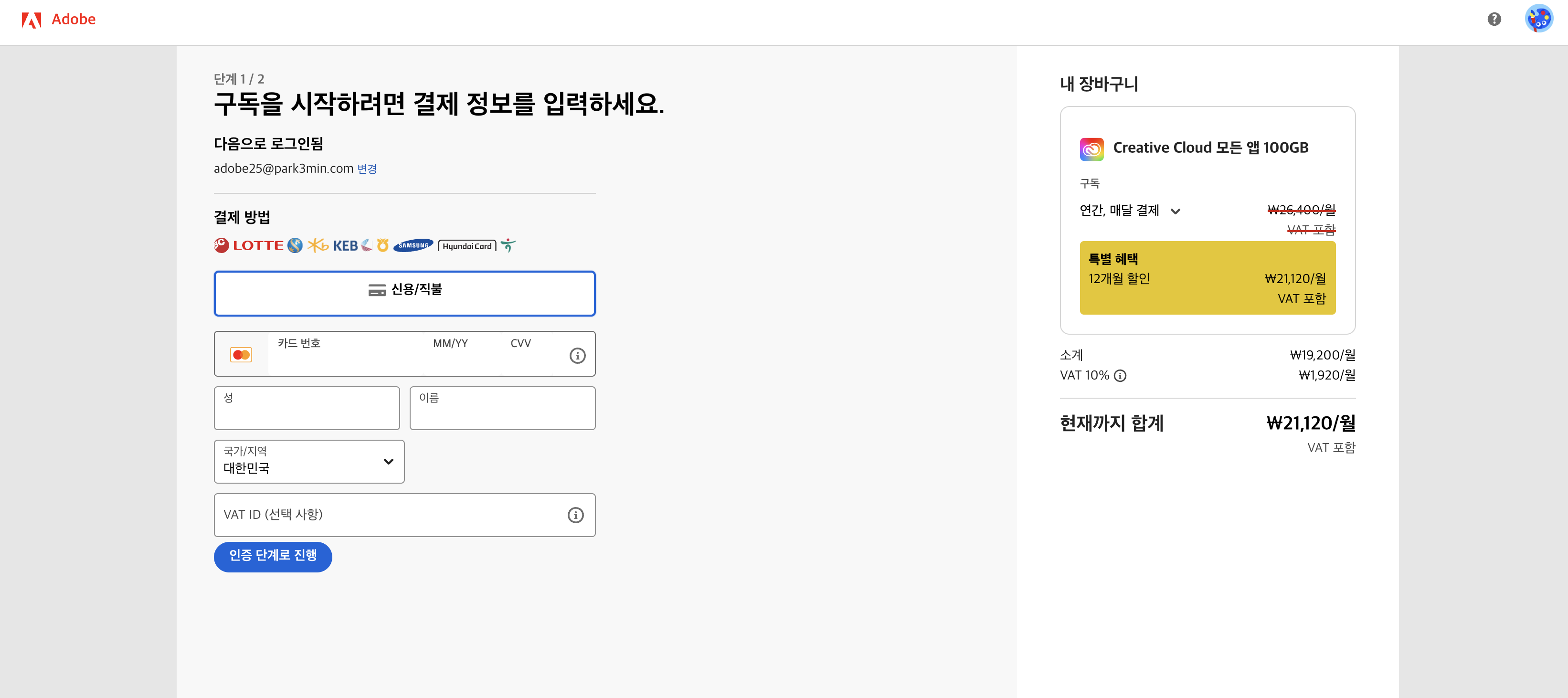 먼저 1단계는 결제 정보를 입력합니다. 카드결제만 되므로 신용카드 정보를 입력합니다.