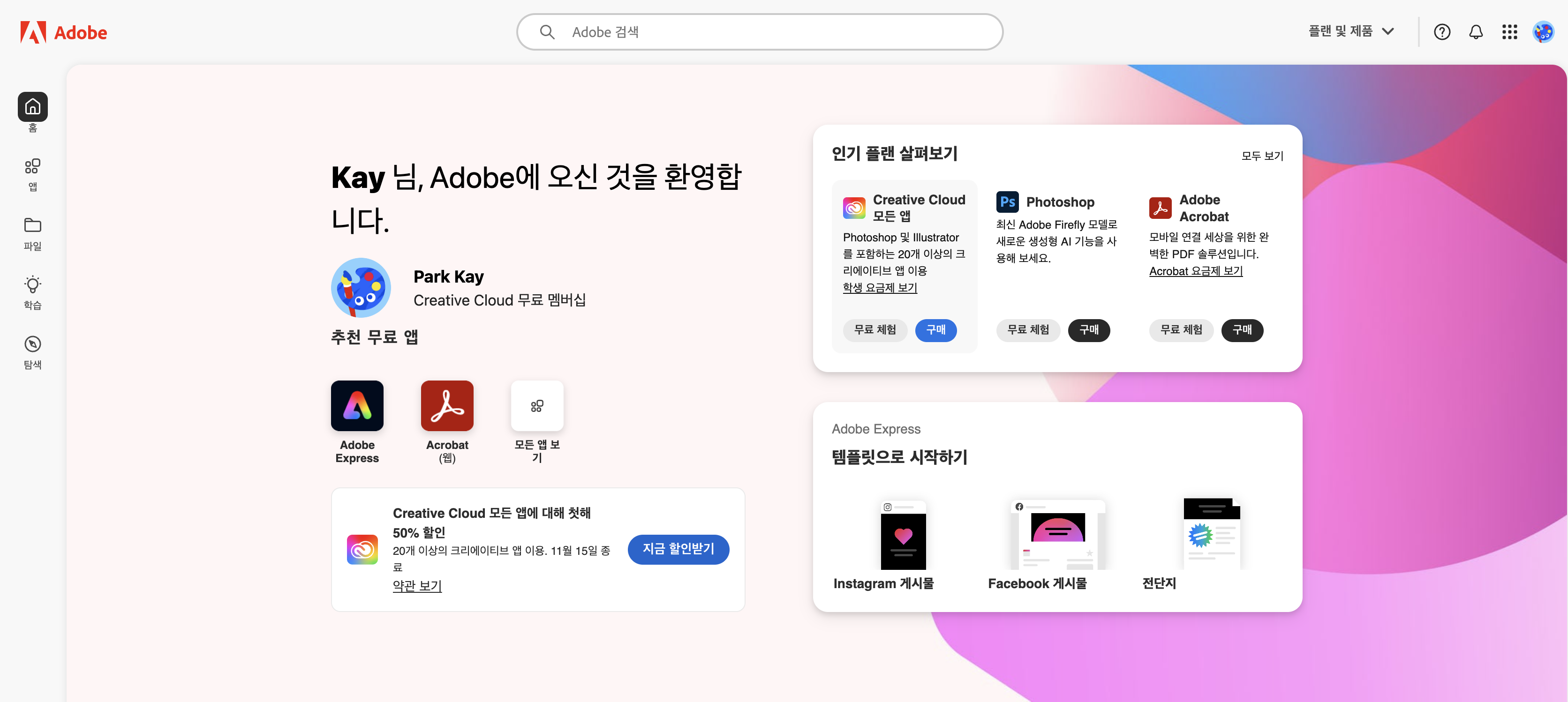 여기서 Cretive cloud 모든 앱에 대해 첫째 50% 할인 - 지금 할인받기 버튼을 클릭합니다.