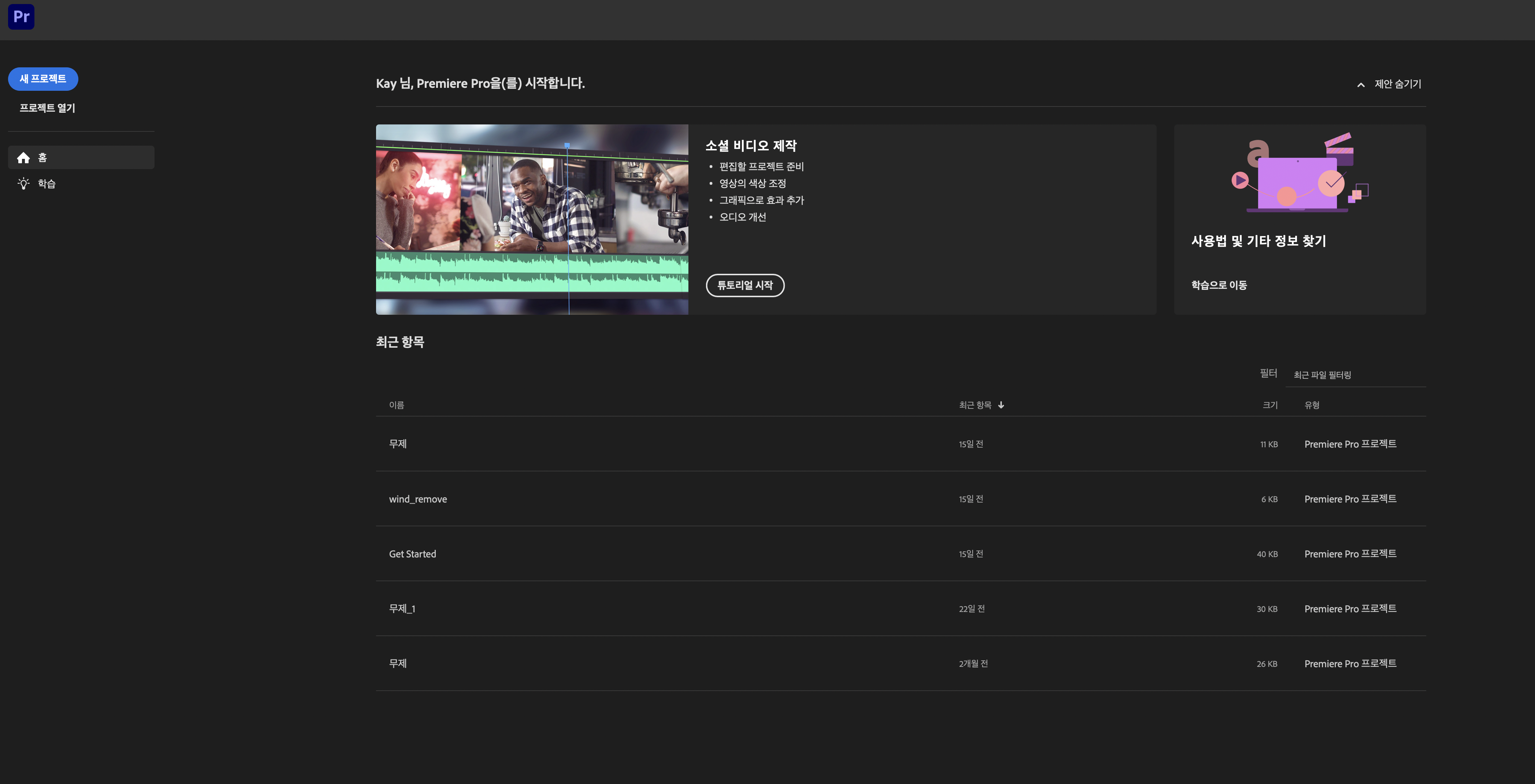 저는 프리미어프로 2025 버전을 먼저 설치하고 실행했습니다.