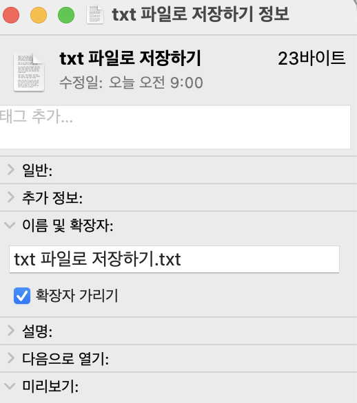 [이름 및 확장자:] 에서 파일의 확장자가 txt로 표시되고 있어 txt 파일로 잘 저장된 것을 확인할 수 있습니다.