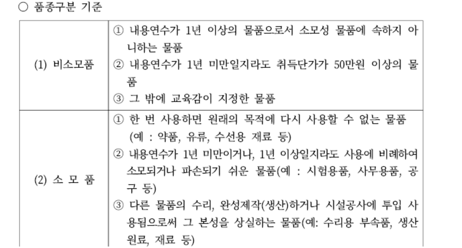 | 비소모품 | 1. 품질 현상이 변하지 않고 비교적 장기간 사용할 수 있는 물품 - 내용연수가 1년 이상의 물품으로 소모성 물품에 속하지 않는 물품 2. 내용연수가 1년 미만일지라도 취득단가 50만원 이상인 물품 3. 그 밖에 교육감이 지정한 물품 |