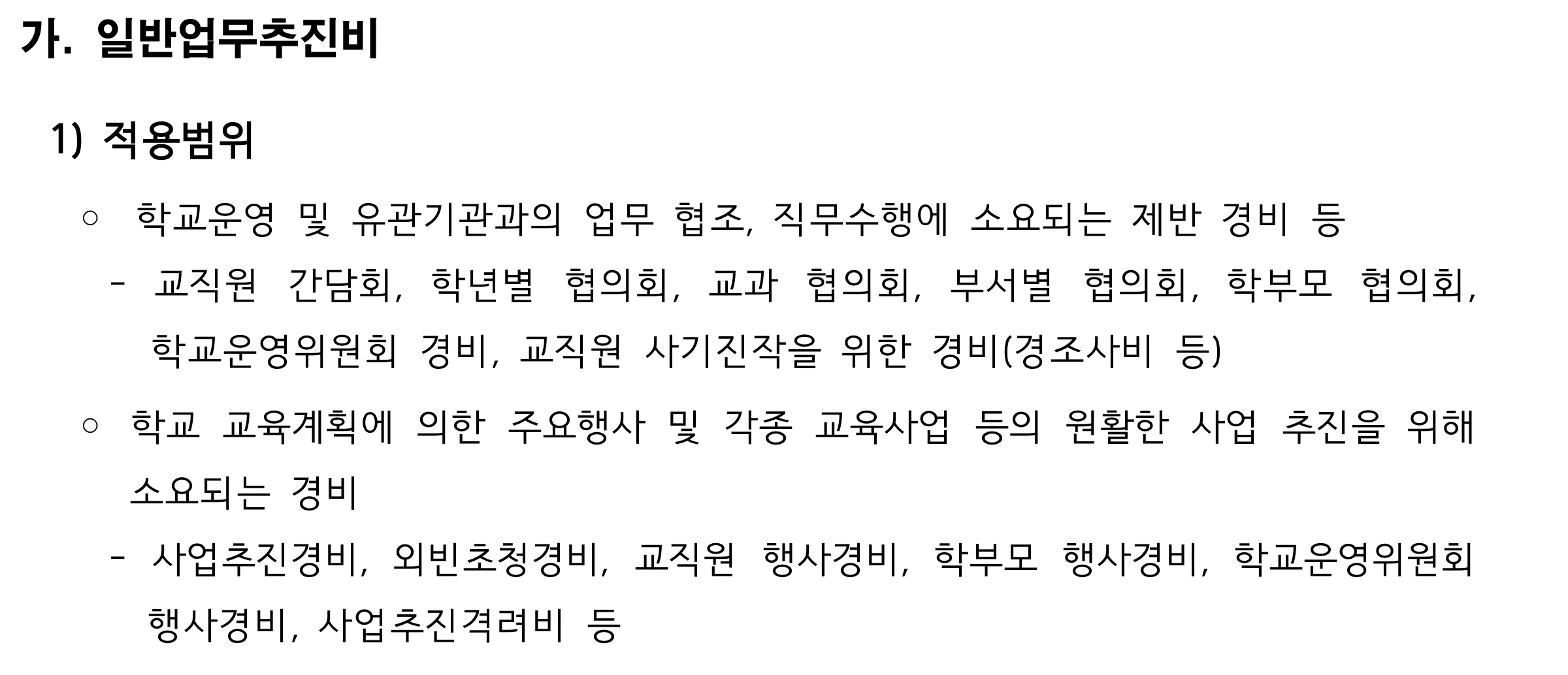 학생들에게 간식이나 이런 부분을 지원하고자 할 때는 교육운영비로 집행하셔야 합니다. 그에 비해 교직원이나 학부모 등과 같은 분에게 다과나 간식 등을 제공하기 위해서는 일반 업무추진비로 집행하셔야 합니다.
