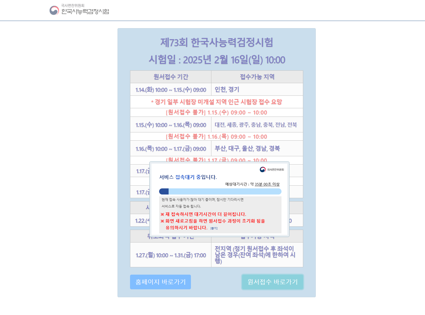 지역 선택 후 시험장 선택을 해야 하는데 시험장 선택할 때도 접수대기창 나타납니다.