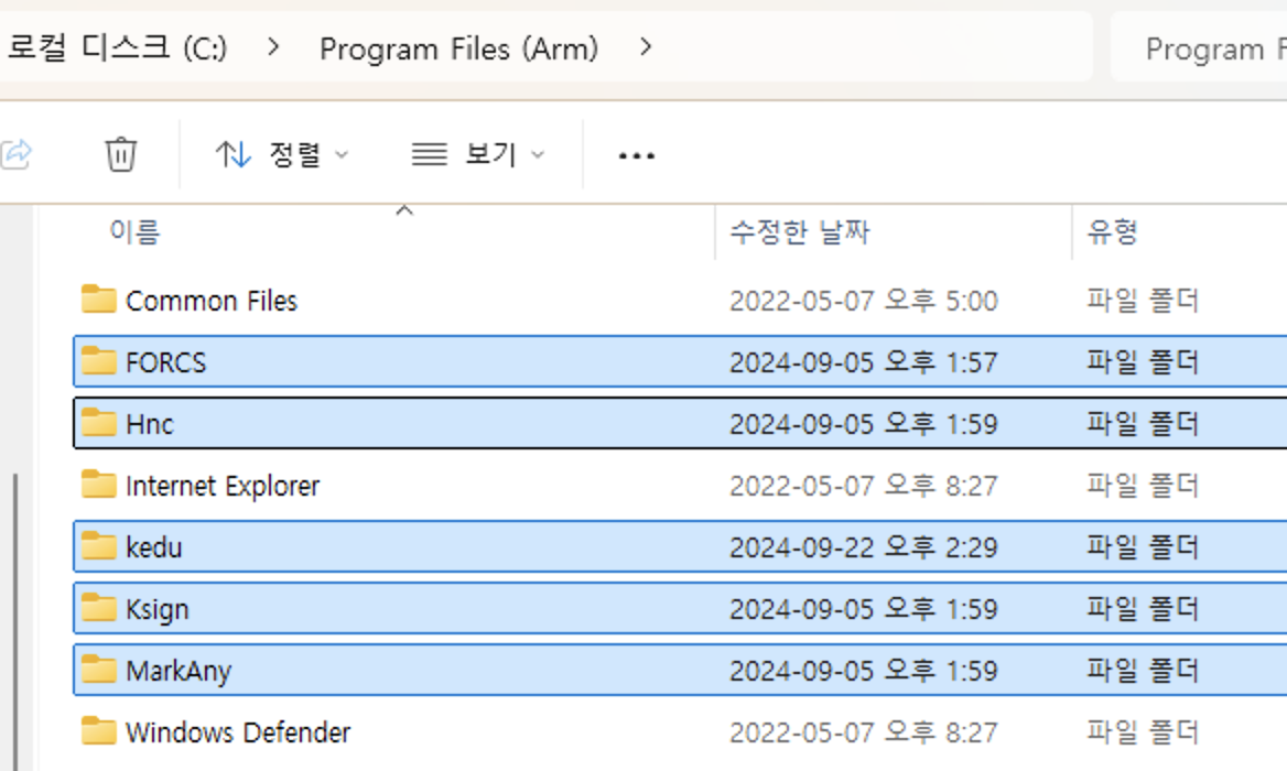 애플 실리콘 맥북은 보통 시스템 특성상 Program Files (ARM) 폴더에 설치된 파일들을 인식하는 반면에, 기본적으로 설치되는 프로그램의 설치 경로는 Program Files (x86) 입니다. 따라서 해당 폴더에 설치된 K에듀파인에 필요한 솔루션들을 ARM 폴더로 옮겨주면 됩니다.