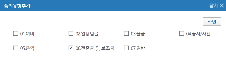 그리고 결재가 끝나면 '재무관리(수입지출)'에서 지출품의등록을 누른 후 품의유형추가를 06. 전출금 및 보조금으로 하고 발송처를 재정과로 보내면 됩니다.