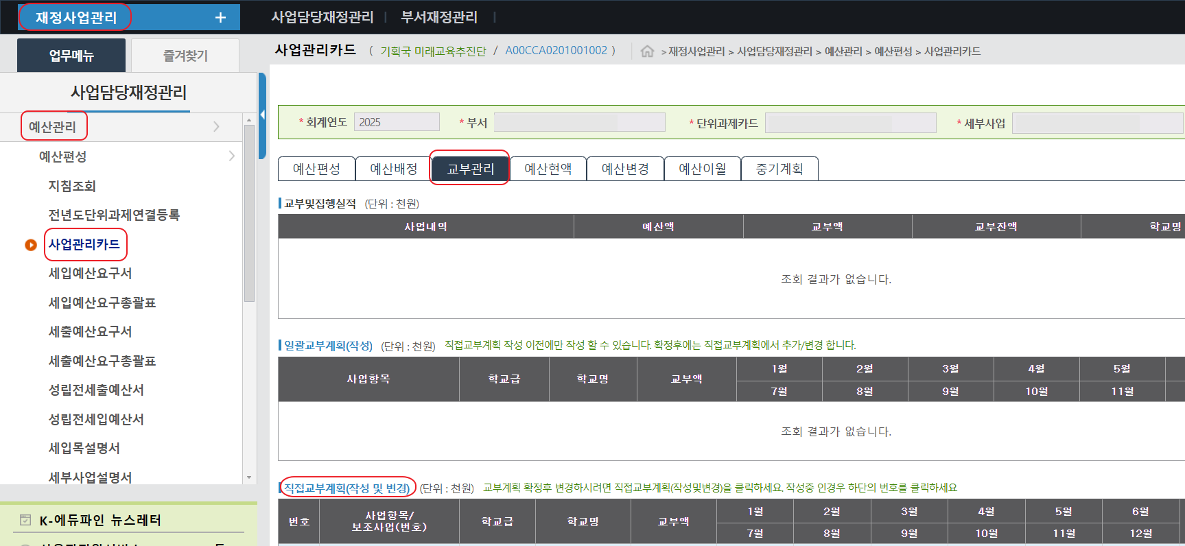 재정사업관리 - 사업관리카드 - 조회 - 예산 항목 클릭 - [교부관리] 탭 - 직접교부계획 을 작성합니다.