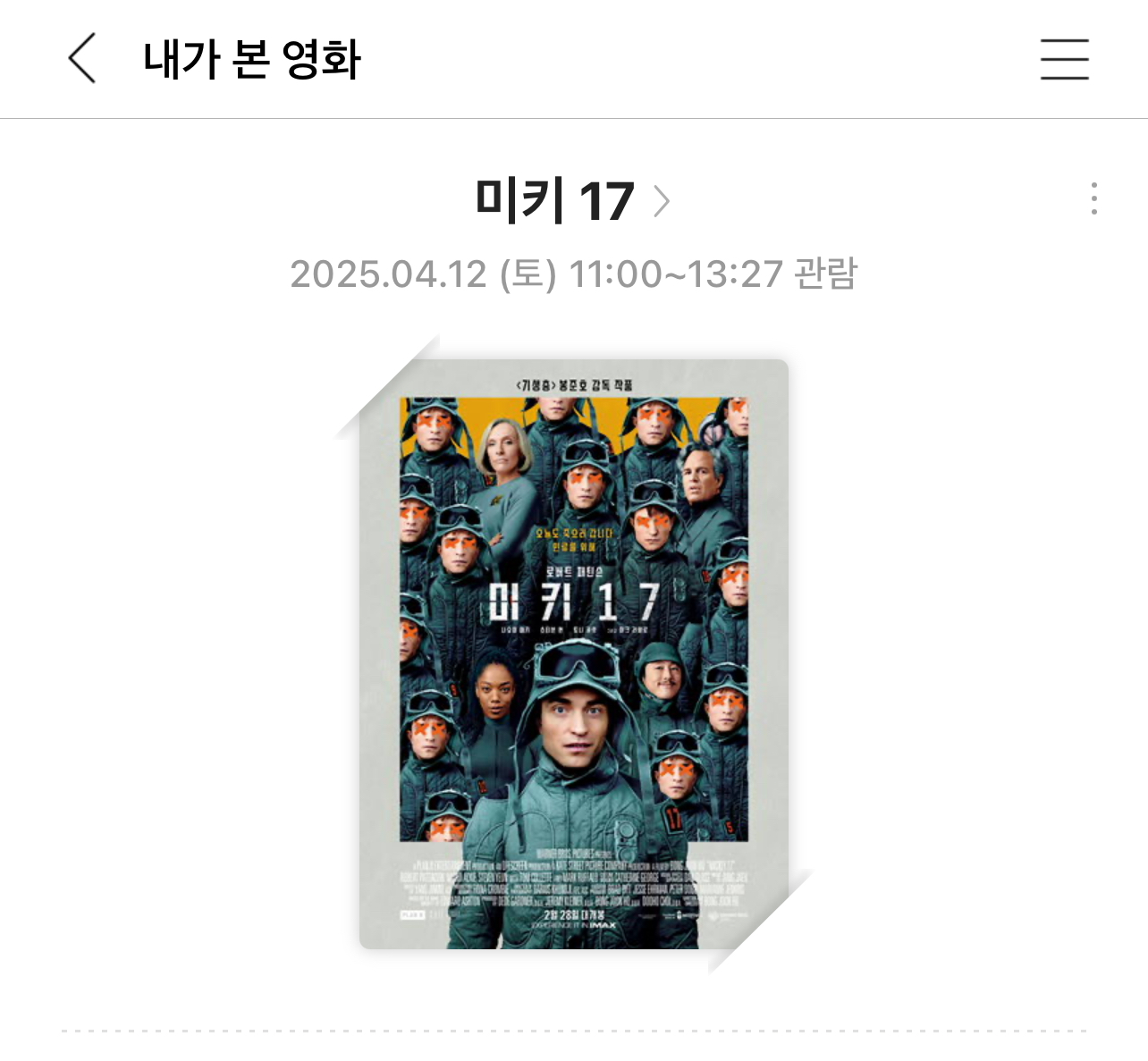 미키17이 거의 극장에서 내려갈 때쯤에 관람했다. 영화에 대한 호불호 평이 많았지만, 나는 참 흥미롭게 봤다. 영화를 보면서 감독님의 사회학과 전공이 다시 상기될 만큼, 역사와 사회적 계급에 대한 마음속 질문과 관점들이 영상미와 음악과 조화롭게 어우러져 2시간을 이끌어 가는 점이 좋았다.