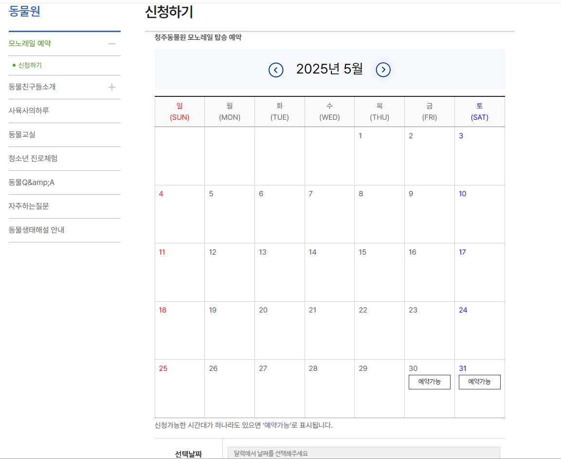 청주동물원이 월요일에 휴원이니 월요일을 제외한 나머지 요일에 낮 시간대에 이용이 가능합니다.