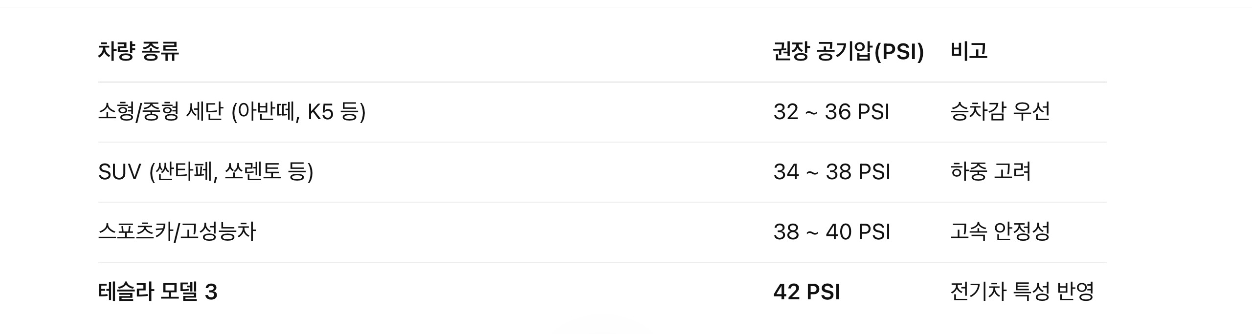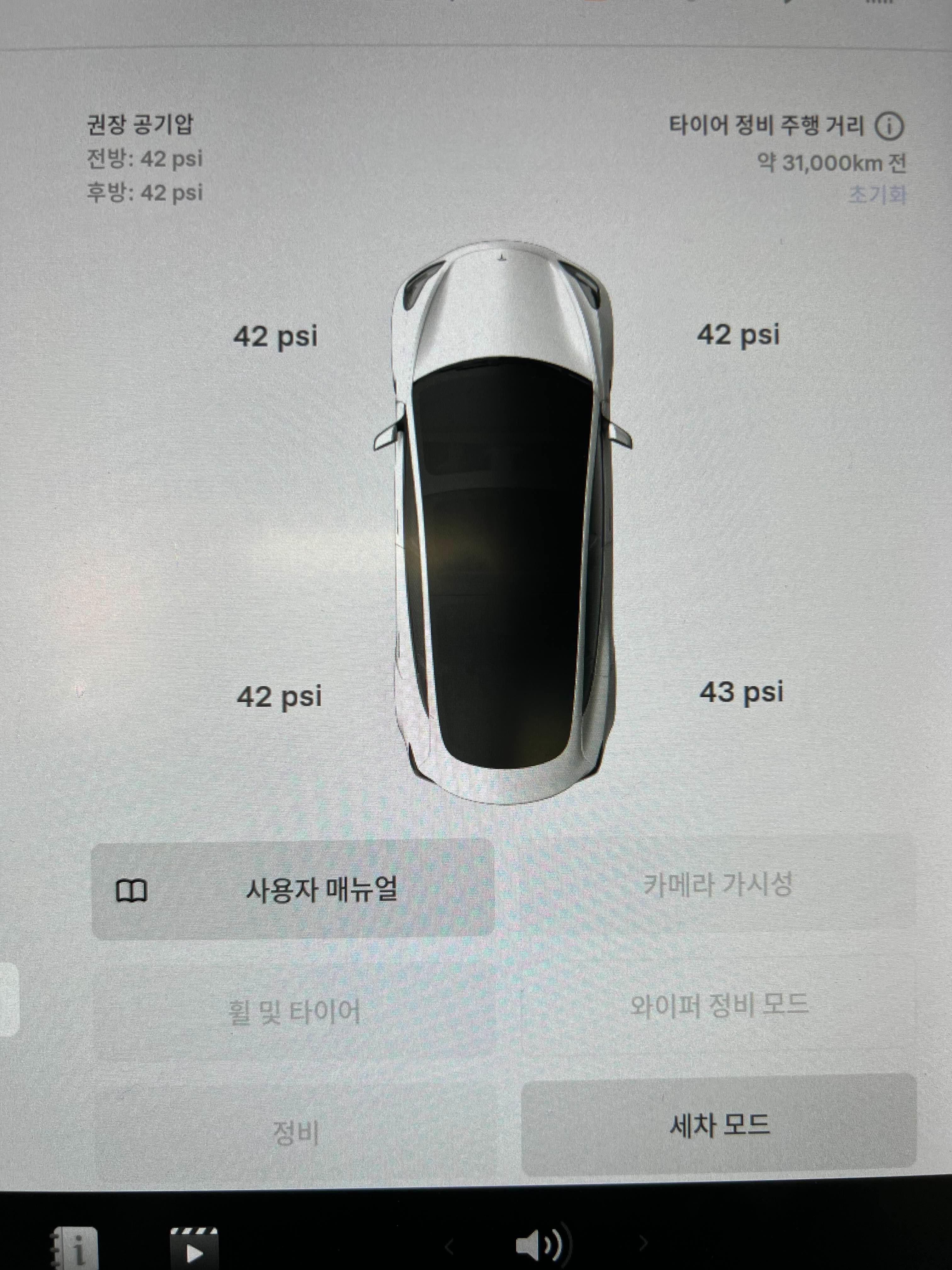 테슬라 모델 3은 적정 공기압이 42 PSI입니다. 확실히 다른 내연기관 차들에 비해 높은 편입니다.