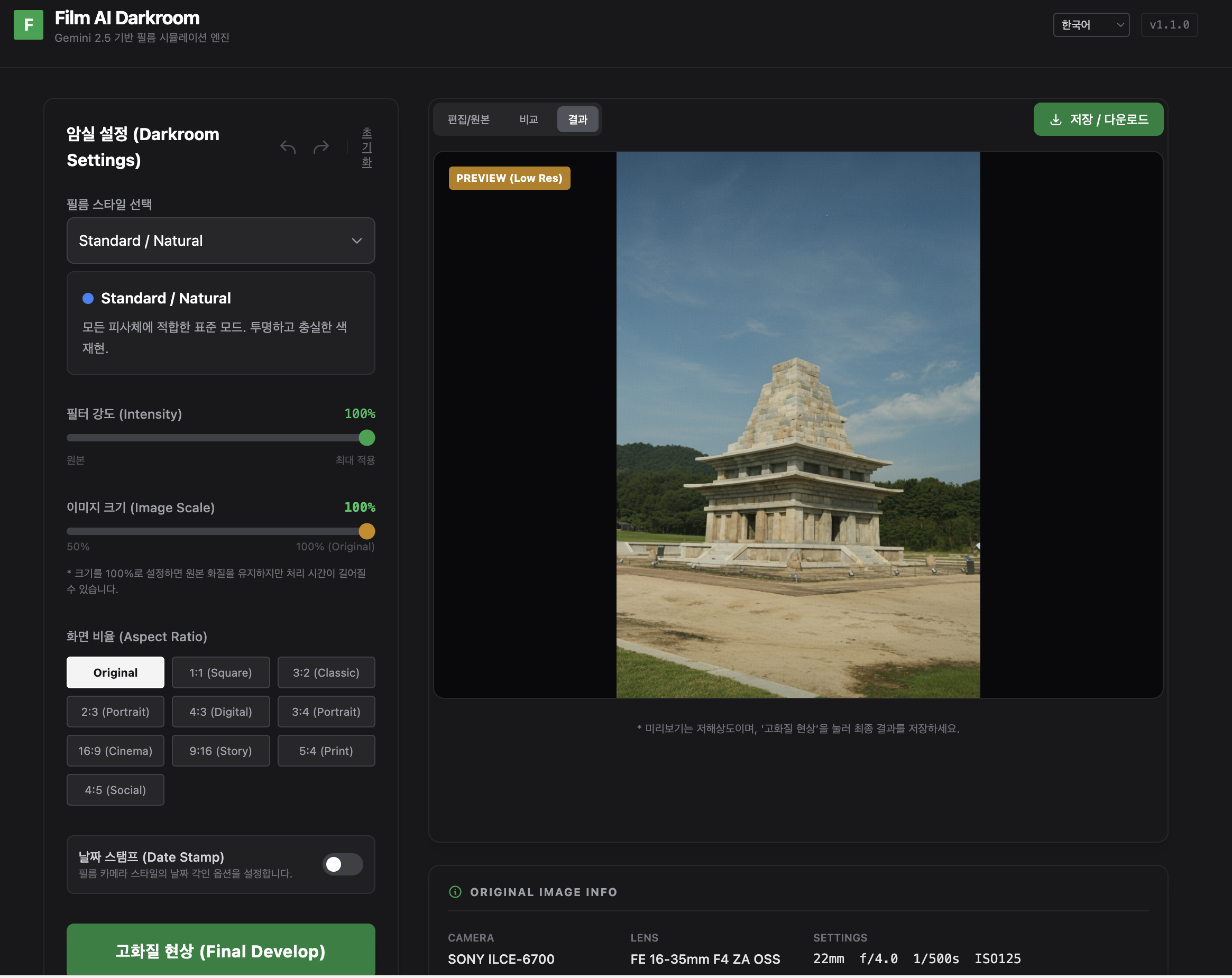 - 잠시 기다리면 필름 시뮬레이션이 적용된 결과물을 확인할 수 있습니다.