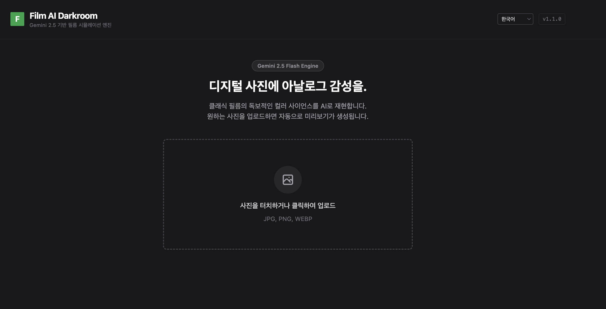 - AI Darkroom 사이트에 접속합니다. https://film-ai-darkroom-244543717280.us-west1.run.app/