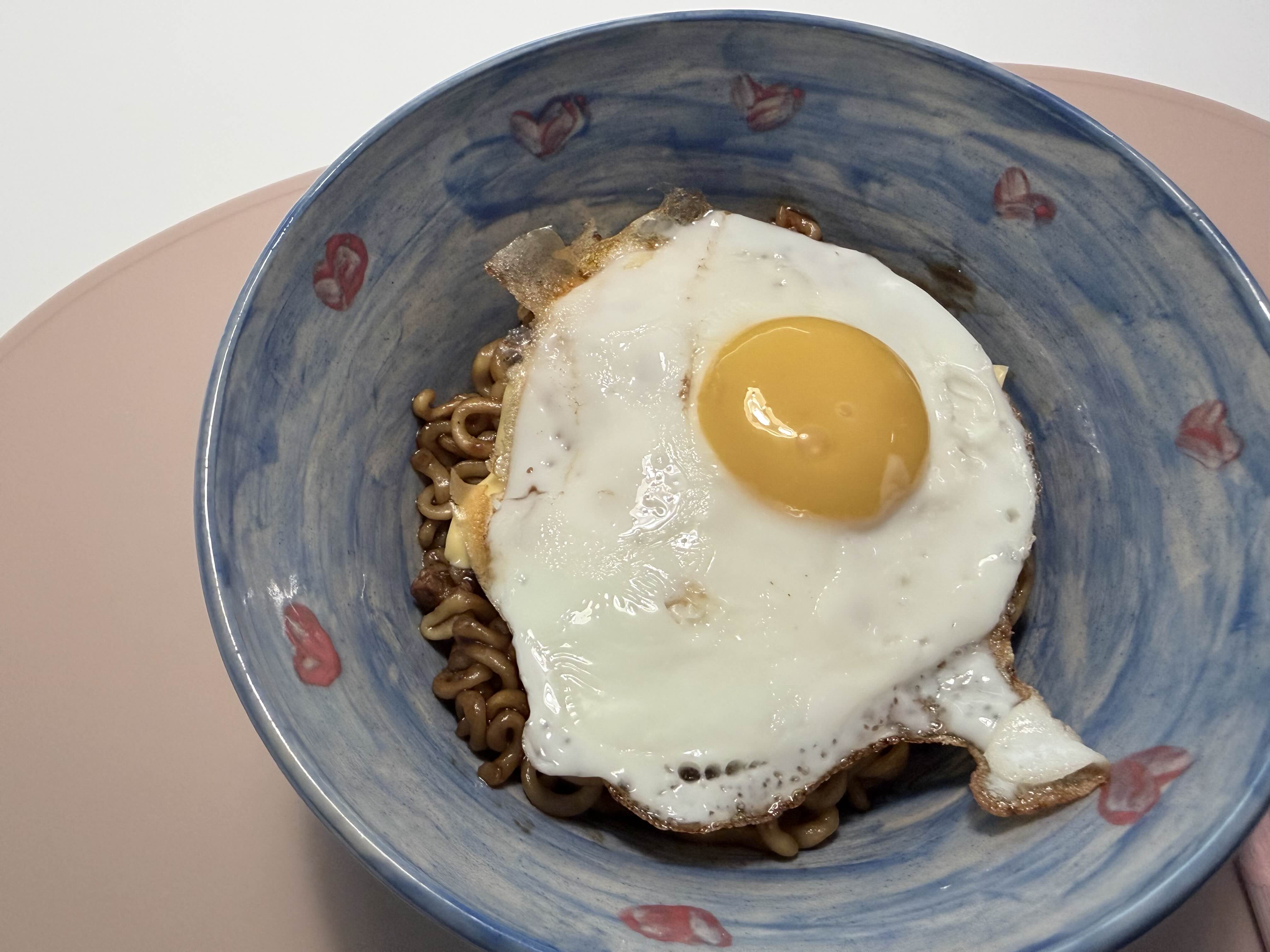 잘 볶아진 면 위에 미리 준비한 치즈와 계란 후라이를 올렸습니다.