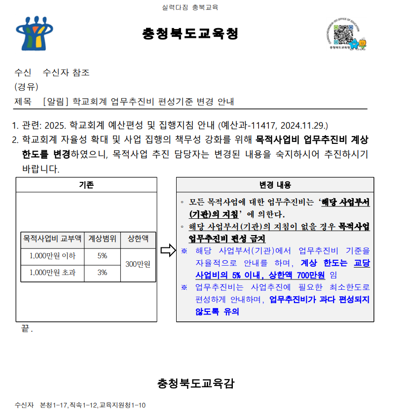 - 지침의 필수성: 이제는 사업 부서에서 업무추진비 편성 기준을 안내하지 않으면 학교에서는 아예 예산을 세울 수 없습니다.