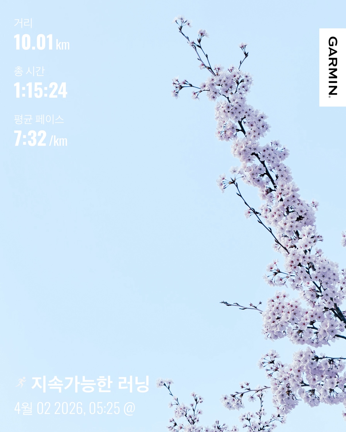 요즘은 봄이 오는 시기라 매일 나무에 핀 꽃이 얼만큼 펴있나 보는 것이 즐거움입니다. 러닝도 편안하게 할 수 있어서 참 감사하구요. 뛰면서 생각을 차분하게 돌아보며 성찰하는 계기로 삼는데 당연하게 생각했던 것들이 당연하지 않고 감사한거구나 함을 느낍니다. 오늘도 건강하게 뛸 수 있음에 감사하며 하루를 시작합니다.